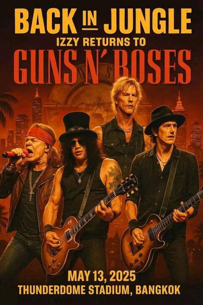 In a surprising turn of events, former Guns N’ Roses guitarist Izzy Stradlin has reunited with the band for their 2025 world tour, making a special appearance at their Bangkok concert. This marks a significant moment in the band’s history, as Stradlin’s involvement had been limited in recent years due to reported disagreements over financial arrangements and other personal reasons .