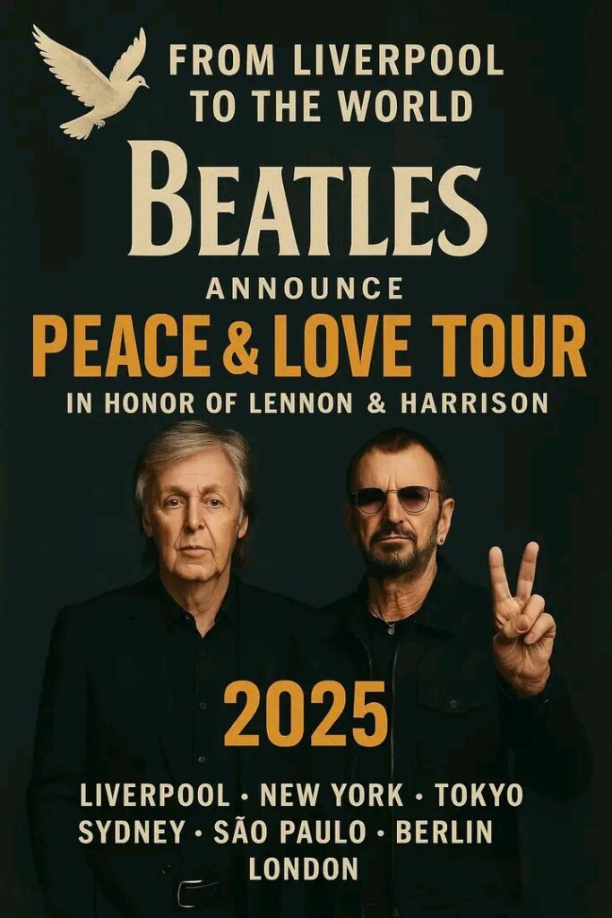 From Liverpool to the World: Beatles Announce 2025 Peace & Love Tour in Honor of Lennon & Harrison. In a moment that sent waves of joy, nostalgia, and reflection through the music world, Paul McCartney and Ringo Starr have officially announced the 2025 “Peace & Love Tour”, a global tribute to their late bandmates, John Lennon and George Harrison. More than just a concert series, this tour promises to be a heartfelt celebration of friendship, legacy, and the eternal message of love that the Beatles brought to the world…