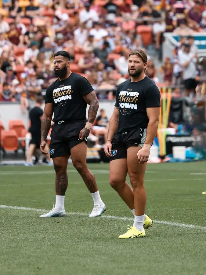The atmosphere was electric as the Gold Coast Titans hit the field for their pre-match warm-up, exuding confidence, focus, and raw determination. With the crowd buzzing in anticipation, two of the team’s standout figures took center stage, embodying the Titans’ unrelenting motto: “Never Back Down.”